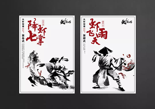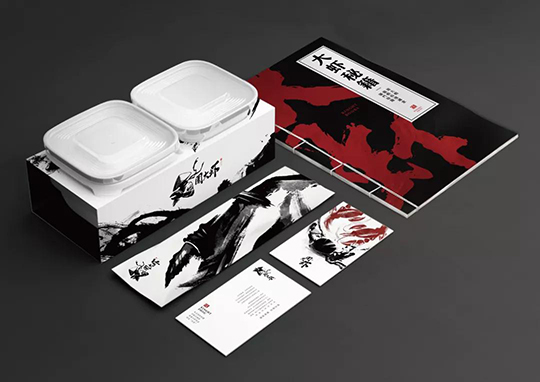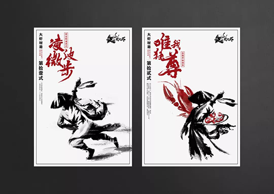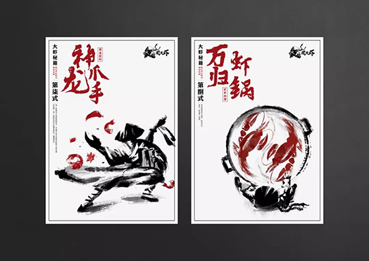 在設計上將大蝦秘籍的概念,融入了各式餐飲品牌VI設計物料內,并且延續中國風武俠的實際風格,化繁為簡,讓品牌升級更完整。