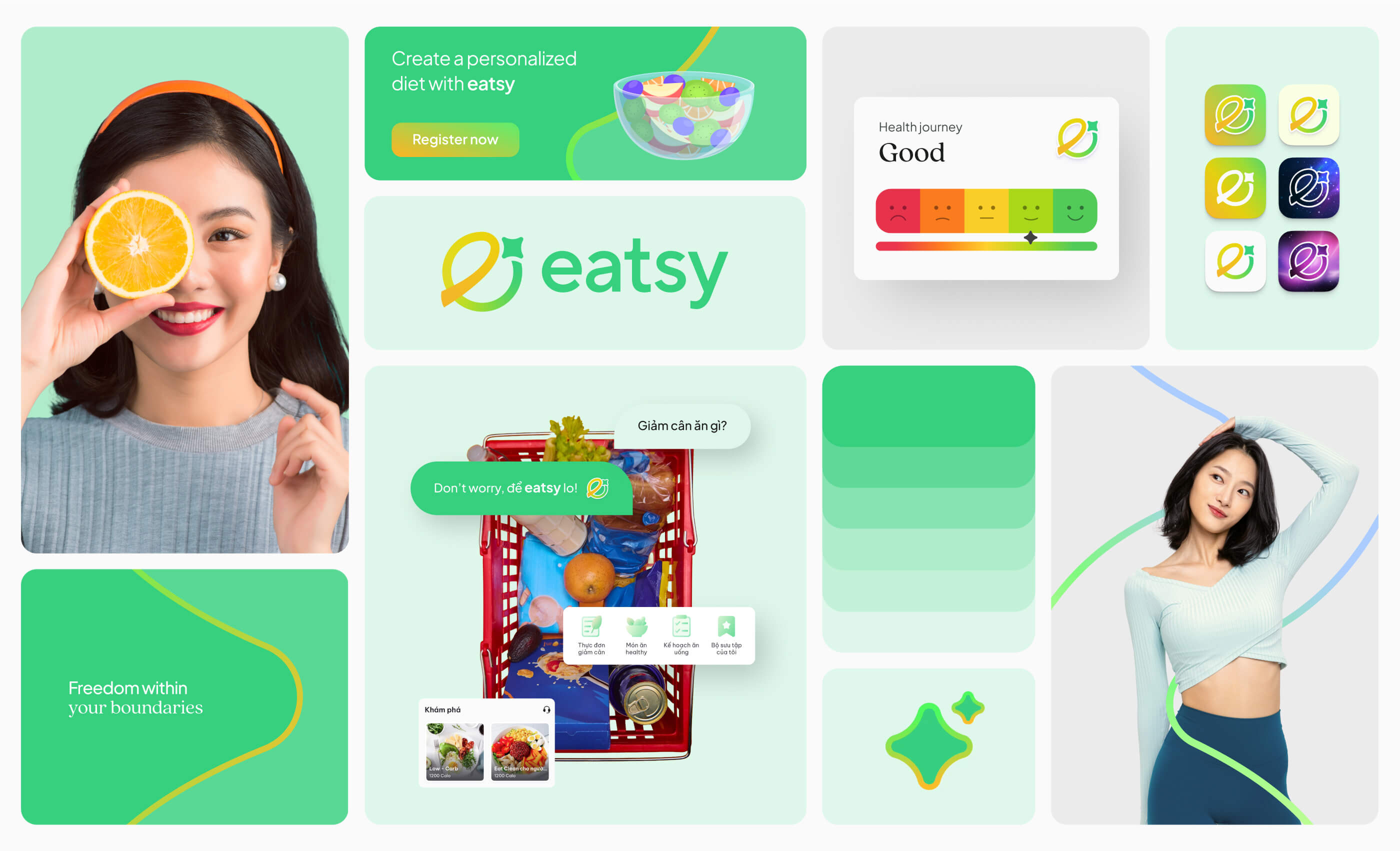 ? 標志采用充滿活力的橙綠色調,在自我蛻變的旅程中喚起積極和自信。同時,在 Eatsy 應用程序中,紅橙綠三色光譜對應著從“SOS”(緊急求救)到“Perfect”(完美)的健康狀態。因此,品牌標識中漸變的運用也象征著持續改善健康的旅程。
