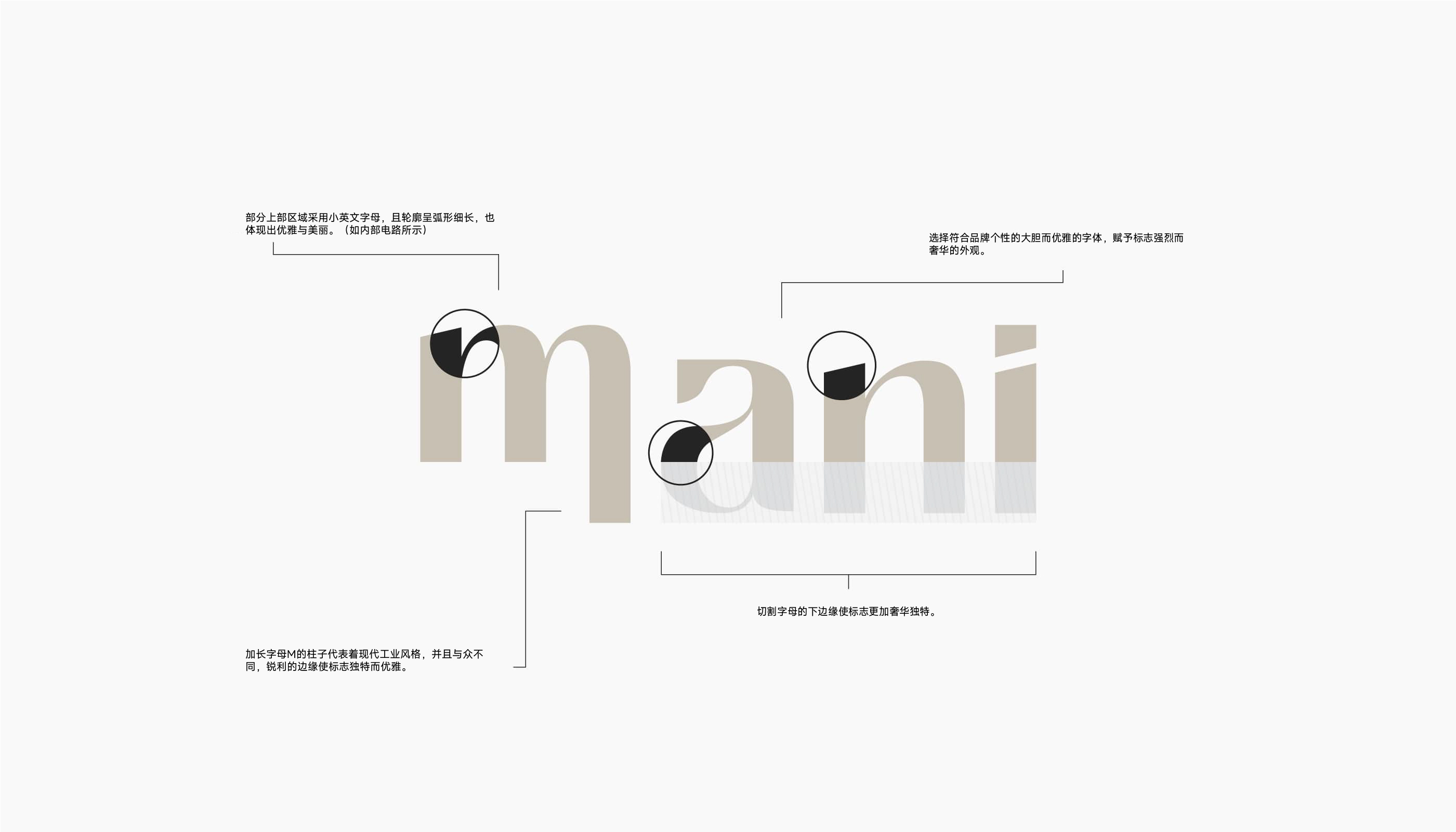 品牌識別系統是核心支撐:“mani”字標采用大膽優雅的定制字體,輔以精妙幾何修飾,兼具精準邏輯與藝術靈動感,確保高辨識度與永恒美感;配色以自然原生色為基底,搭配柔緩中性色與點睛對比色,平衡質感與溫度,告別高端品牌常見的冰冷感,傳遞“奢華即親近”的主張。