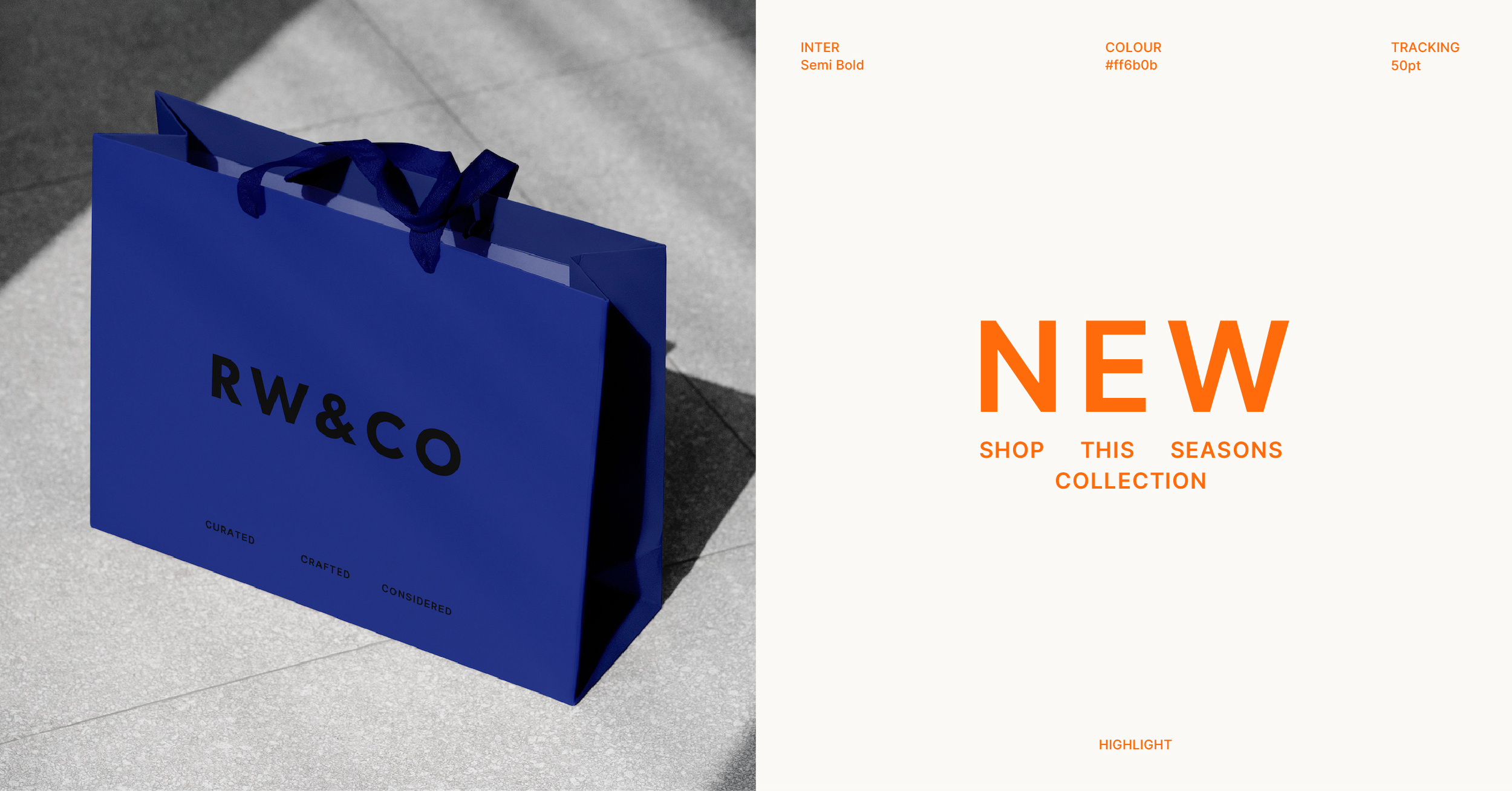 除了 RW&CO. 標志的黑白色調外,為了提升其在加拿大時尚領域的影響力,品牌重塑還引入了更豐富的配色方案。其中包括簡潔精致的核心色彩,用于提升溝通和關鍵信息傳遞的效果;以及色彩更豐富的輔助色,用于包裝和購物袋等需要更個性化表達的場合,從而提升品牌的個性、辨識度和影響力。品牌明確了色彩運用方法,確保所有平臺的信息傳遞一致性和清晰度。