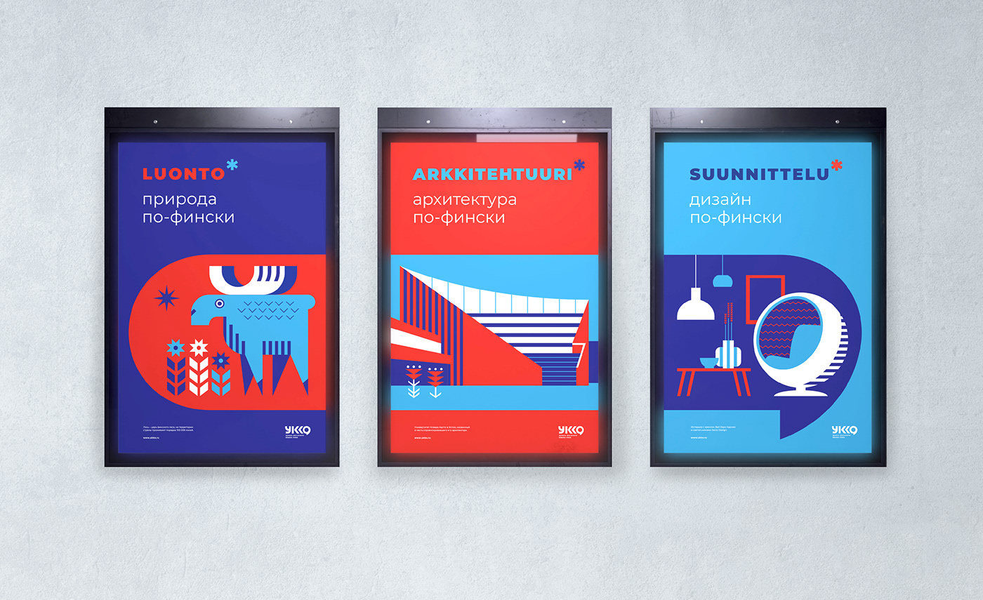 一系列廣告海報設(shè)計-也是基于芬蘭文字。帶有插圖的框架被組合成一個企業(yè)對話云。海報設(shè)計代表了芬蘭著名的屬性(芬蘭自然-麋鹿,建筑-阿爾托大學(xué),設(shè)計-芬蘭內(nèi)部項目)。