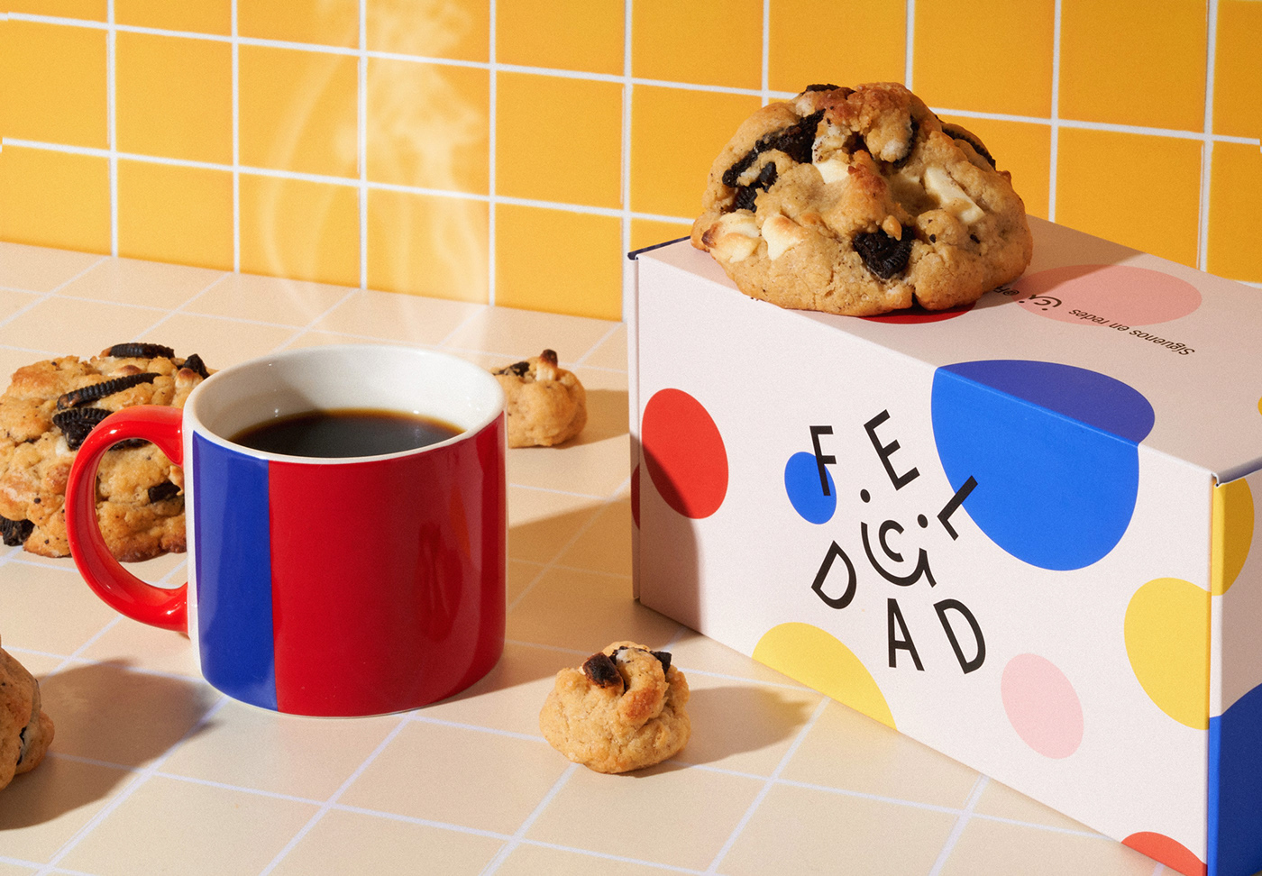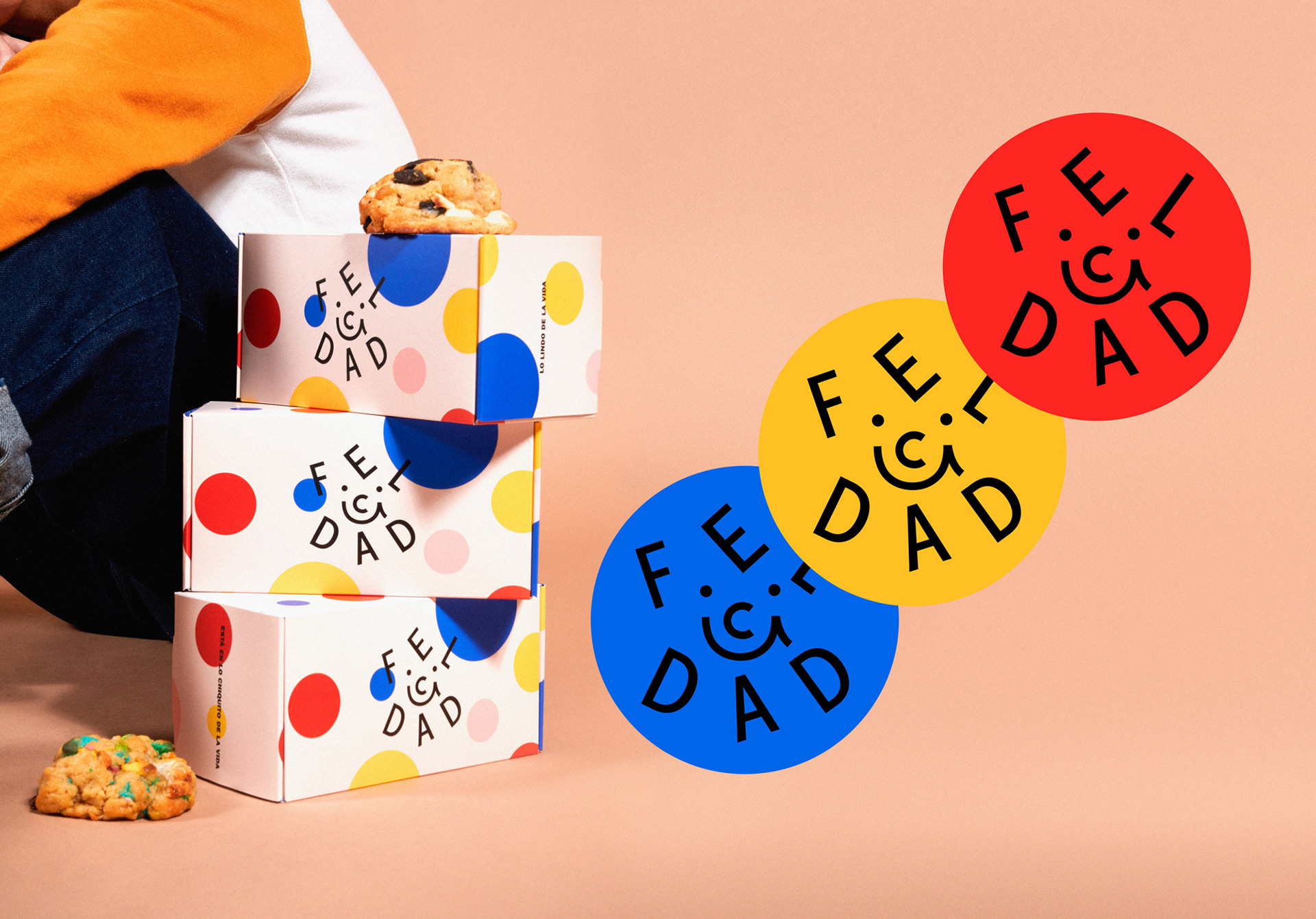 品牌設(shè)計中我們創(chuàng)建了 cookie 包的超級符號,其中包含一系列讓人們開心的事情。創(chuàng)作過程的秘訣結(jié)合了一點懷舊、大量的原色和一些童年記憶的烘焙。因此,F(xiàn)elicidad 的品牌標(biāo)識具有傳染性,就像幸福一樣。
