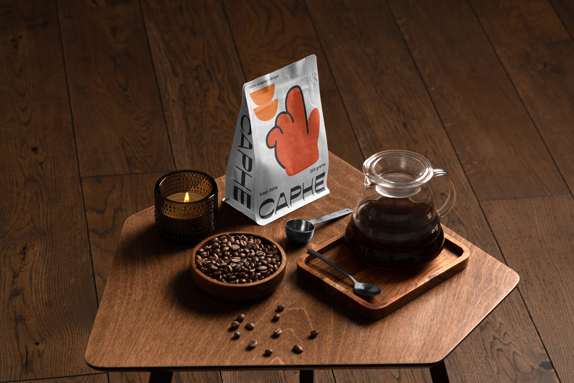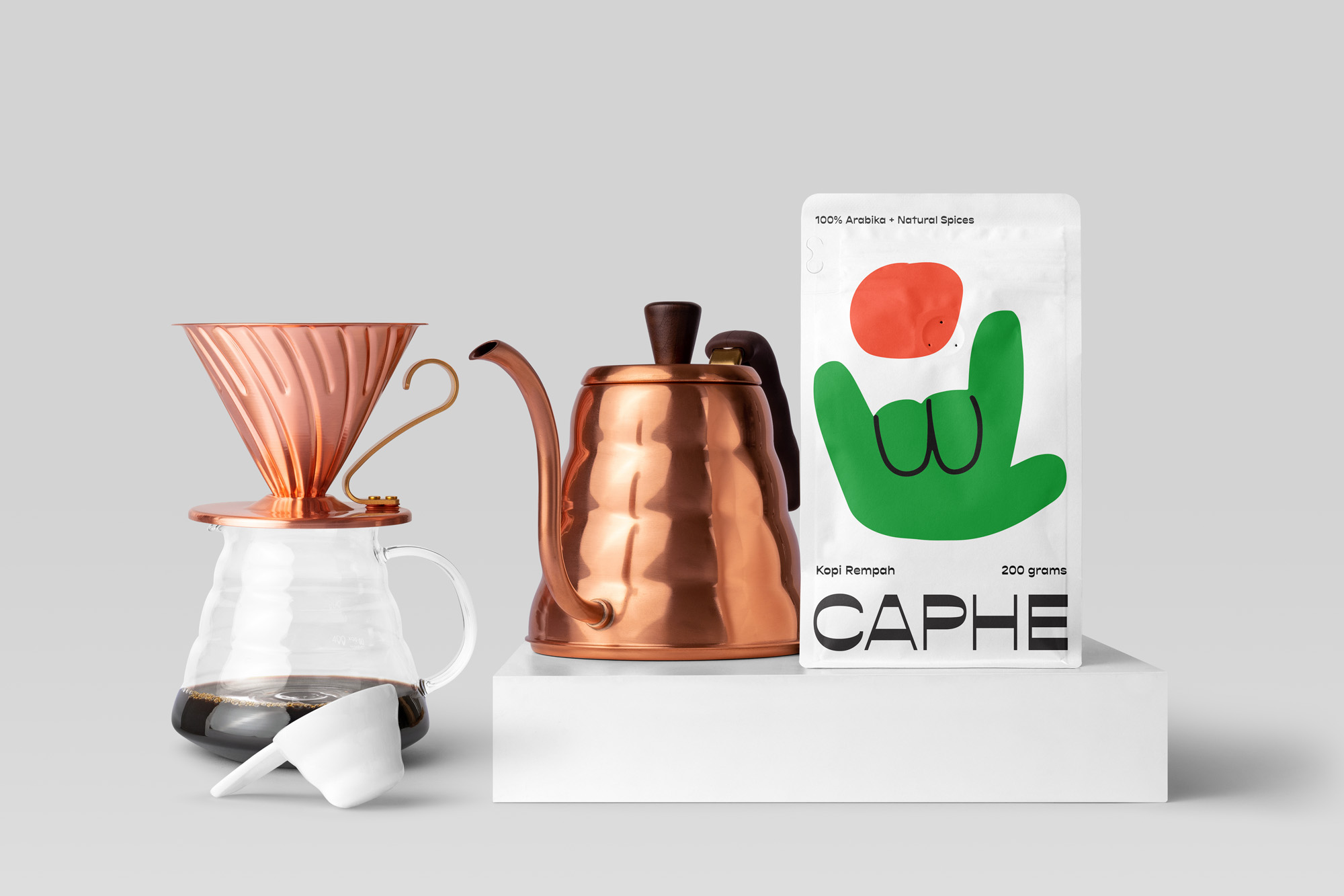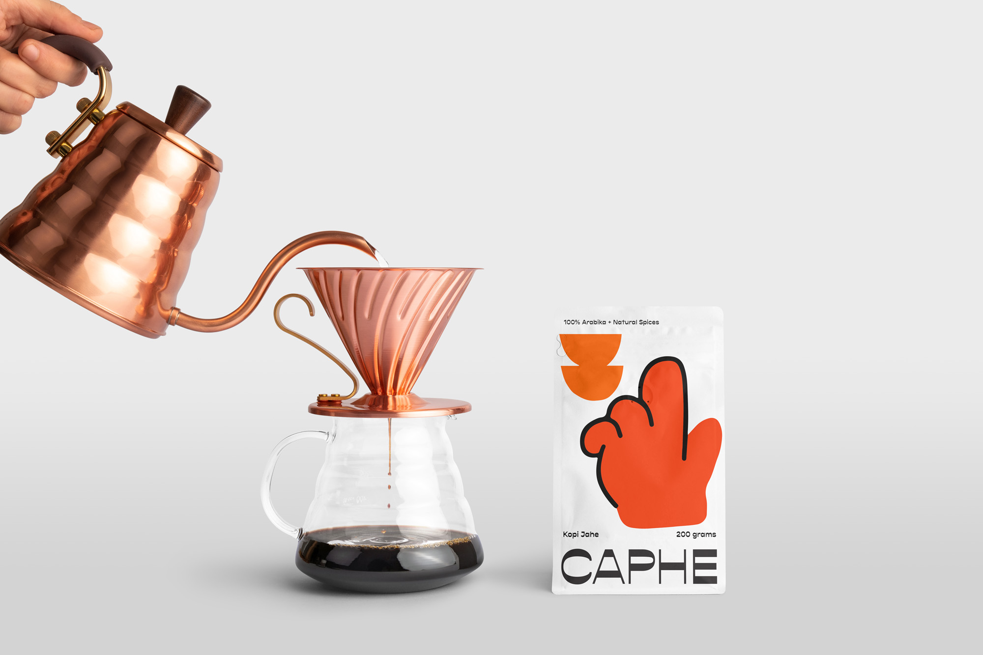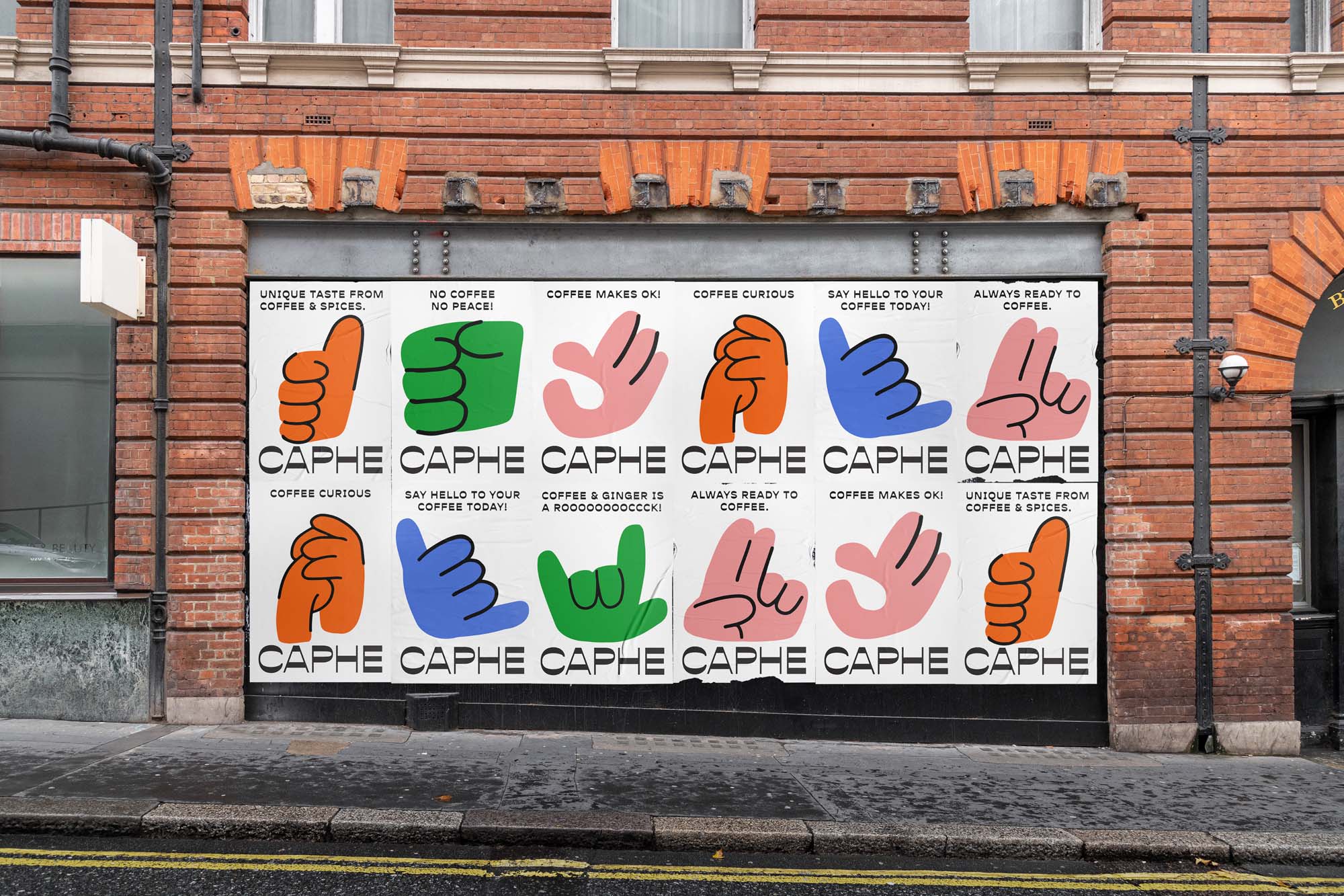 我們選擇Opposit作為Caphe的字體,這種字體是獨一無二的,字母的每個字符上都有粗而細的筆畫。在包裝設計中,我們試圖拋開以咖啡為基礎的包裝設計思想。與大多數咖啡設計不同,姜汁咖啡自動地以姜汁插圖為特色,這太普通和無聊了。我們設計了一個手勢的插圖,作為享受咖啡的滿足感的標志。除了是包裝上的一個身份和設計,這個插圖也是一個附屬于品牌的圖像。它與眾不同,獨一無二,引人注目。