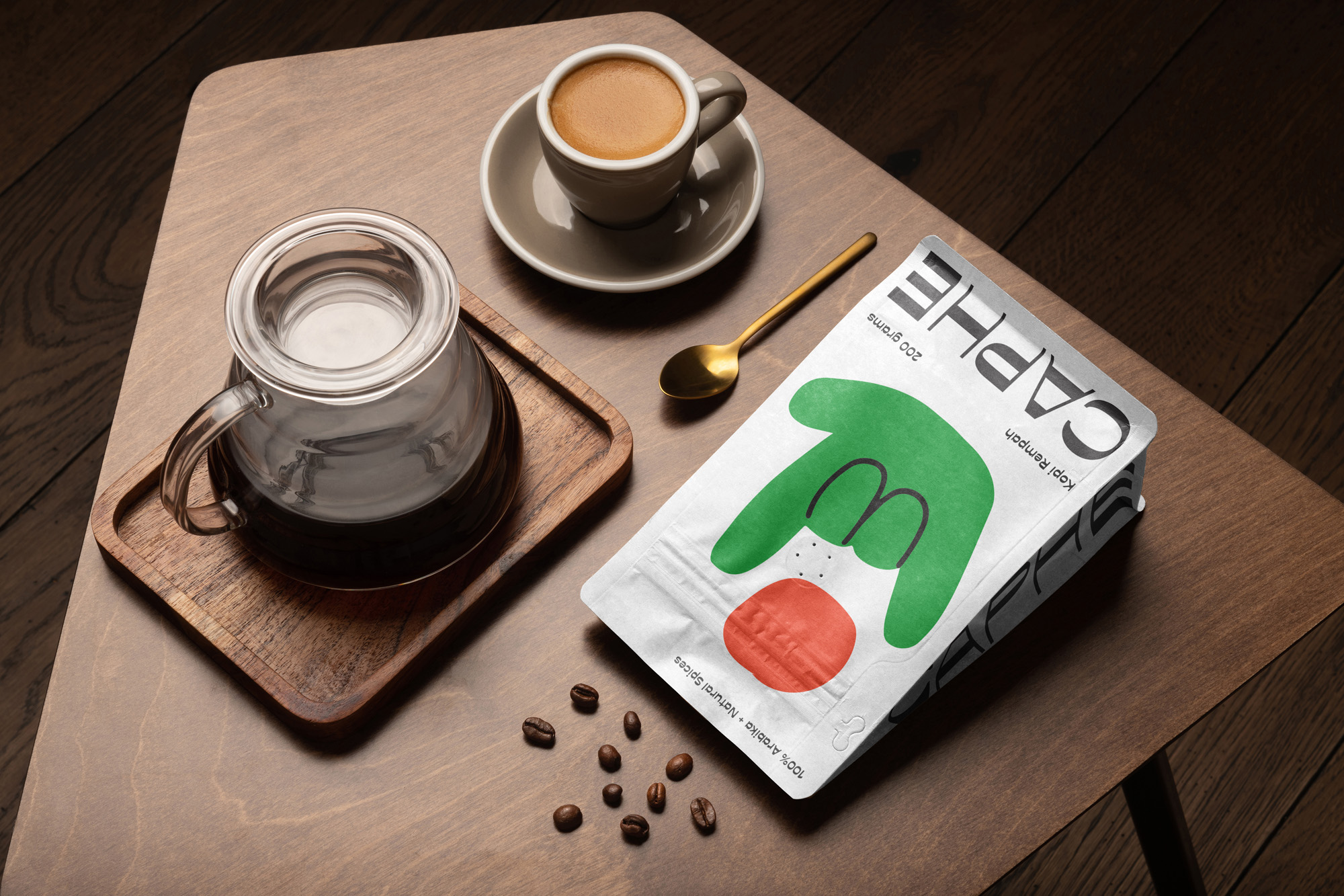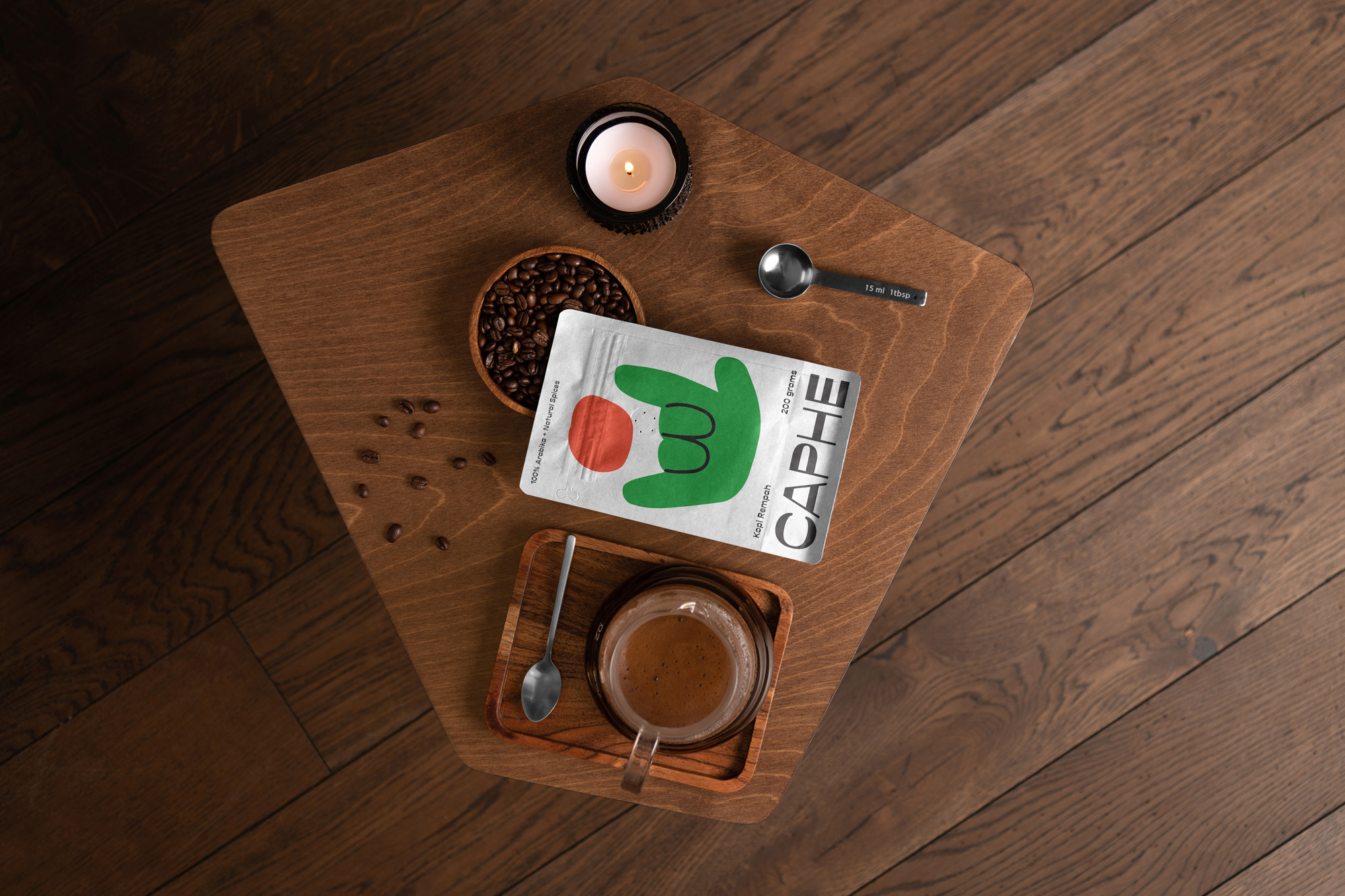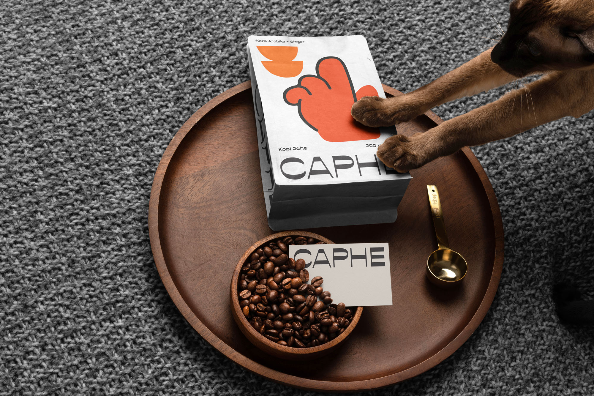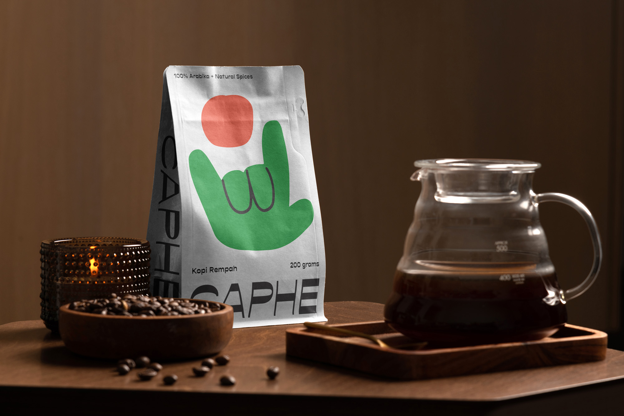 我們選擇Opposit作為Caphe的字體,這種字體是獨一無二的,字母的每個字符上都有粗而細的筆畫。在包裝設計中,我們試圖拋開以咖啡為基礎的包裝設計思想。與大多數咖啡設計不同,姜汁咖啡自動地以姜汁插圖為特色,這太普通和無聊了。我們設計了一個手勢的插圖,作為享受咖啡的滿足感的標志。除了是包裝上的一個身份和設計,這個插圖也是一個附屬于品牌的圖像。它與眾不同,獨一無二,引人注目。