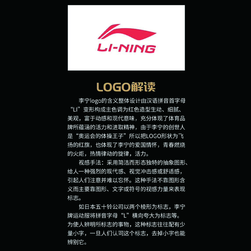 新一代的李寧商標(biāo)跟以往略月不同。為了配合全球市場(chǎng)的拓展,李寧體育用品有限公司將在2010年第三季度開(kāi)始更換新的LOGO,產(chǎn)品涉及李寧運(yùn)動(dòng)鞋、服飾、配件及球類等全部產(chǎn)品線,同時(shí)全球李寧專賣店和企業(yè)UI都將使用此新標(biāo)志。李寧新LOGO的設(shè)計(jì)依舊沿用了舊標(biāo)志的設(shè)計(jì)概念,飄動(dòng)的造型將更加銳利和富有動(dòng)感,傳達(dá)給消費(fèi)者“突破、進(jìn)取、創(chuàng)新”的產(chǎn)品文化。李寧商標(biāo)隨著李寧口號(hào)的改變而改變,“Make The Change”成為了李寧的品牌新口號(hào),將會(huì)在市場(chǎng)推廣中替代“一切皆有可能”。“源于全新的品牌宣言,體現(xiàn)了從敢想到敢為的進(jìn)化,鼓勵(lì)每個(gè)人敢于求變、勇于突破,是對(duì)新一代創(chuàng)造者發(fā)出的呼告號(hào)召。”李寧公司品牌負(fù)責(zé)人表示。新的李寧商標(biāo)不但傳承了經(jīng)典LN的視覺(jué)資產(chǎn),還抽象了李寧原創(chuàng)的“李寧交叉”動(dòng)作,又以“人”字形來(lái)詮釋運(yùn)動(dòng)價(jià)值觀。李寧公司品牌負(fù)責(zé)人解釋稱:“鼓勵(lì)每個(gè)人透過(guò)運(yùn)動(dòng)表達(dá)自我、實(shí)現(xiàn)自我。新的標(biāo)識(shí)線條更利落,廓形更硬朗,更富動(dòng)感和力量感。