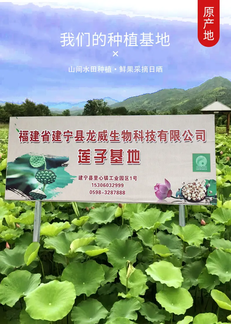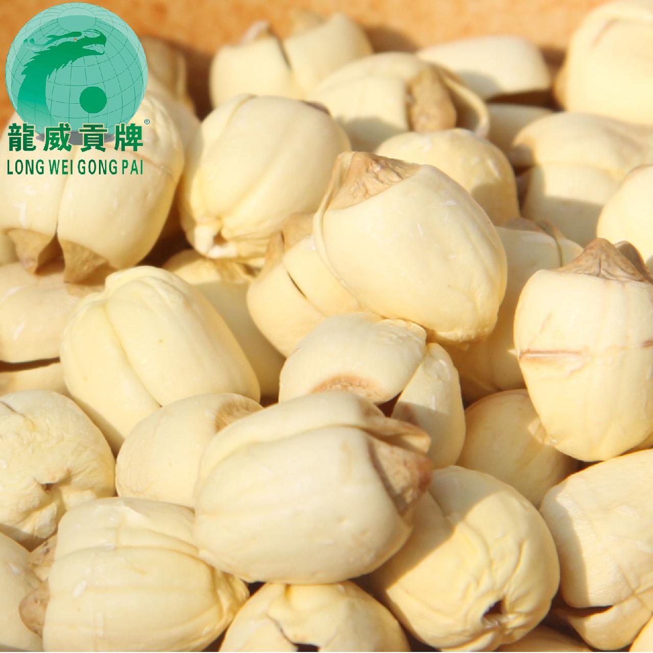 龍威貢牌是福建省建寧縣龍威生物科技有限公司的品牌。公司位于福建閩西北,具有得天獨厚優良氣候與環境.地處閩江源頭,閩江源頭的水質極佳,無污染。龍威貢牌蓮子,龍威貢牌銀耳(白木耳)就是用閩江最源頭的水灌溉著。其蓮子粒大,粉.嫩.香。銀耳口感似燕窩,富含豐富的植物膠質,享素食燕窩之美譽。公司已建成農場化蓮子基地1000多畝,銀耳(白木耳)種植基地200畝,專業計術員工廠化統一管理,種植過程中不使用化肥農藥,產品全部可經國際檢測SGS機構檢測368項農殘合格,主要出口到美國,臺灣,日本,香港.新加坡。